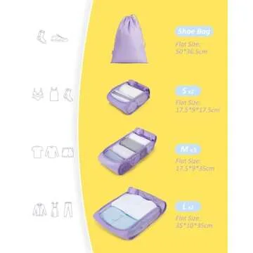 Show more Introducing the ultimate solution for organized travel: the BAGSMART 7 Set Packing Cubes. These packing cubes are intelligently designed to accommodate all your travel essentials, ensuring that you travel in style while keeping your belongings organized and easily accessible. These versatile packing aids come in a variety of sizes, including 1 large cube (13.8” × 3.9” × 13.8”) perfect for jackets and sweaters, 3 medium cubes (6.9” × 3.5” × 13.8”) ideal for shirts and T-shirts, and 2 small cubes (6.9” × 3.5” × 6.9”) great for underwear and socks. Plus, it comes with a spacious shoe bag (19.7” × 14.5”). This diverse range of sizes is designed to meet all your packing needs, whether for a short getaway or an extensive vacation.