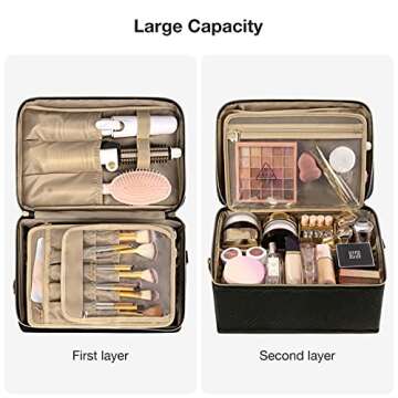 BAGSMART Large Makeup Bag, Double-Layer Makeup Case with Shoulder Strap Cosmetic Organizer Bag Train Case for Makeup Brushes Palettes Sponge Toiletries,Large,Black