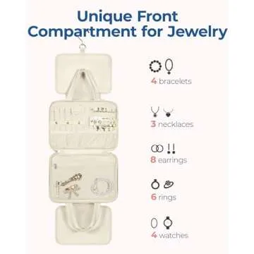Show more Introducing the ultimate travel companion, the Bagsamrt Toiletry Bag, specifically designed for those who love to explore without compromising on organization. This innovative bag features a unique jewelry compartment, allowing you to safely store rings, earrings, bracelets, and necklaces right at the front, making it easier than ever to travel with all your personal items. Gone are the days of rummaging through your luggage; this bag provides a designated spot for all your essentials!