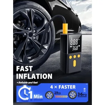 Show more Introducing the BAIPENY Portable Tire Inflator for Car, your ultimate solution for efficient and speedy inflation. Designed for the modern driver, this powerful tire air pump boasts an impressive capacity of 150 PSI, enabling it to inflate small car tires (25-36 PSI) in less than 60 seconds—four times faster than many competitors! Whether you're preparing to hit the road or dealing with an unexpected low tire pressure, this portable tire inflator gets you back on track in no time, combining speed and reliability in one sleek package.
