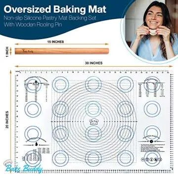 Bake Buddy Silicone Pastry Mat Baking Set, Jumbo XL Size Dough Rolling Mat, Fondant/Pie Crust Mat With Measurements, Bonus Wooden Rolling Pin Included With This 30” x 20” XL Silicone Baking Mat