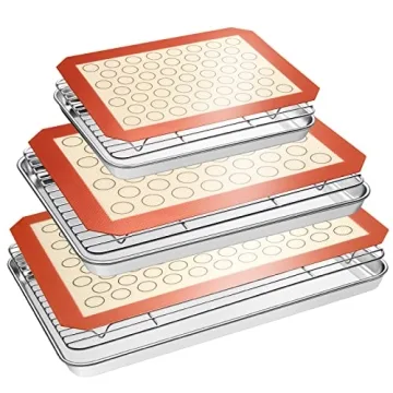 Show moreIntroducing the ultimate kitchen companion for baking enthusiasts - our Baking Sheet Tray Cooling Rack with Silicone Mat Set. This set includes 3 large stainless steel baking sheets, 3 durable cooling racks, and 3 high-quality silicone baking mats, making it the perfect combination for all your baking needs. Whether you're whipping up a batch of cookies, baking crispy bacon, or cooling freshly baked pastries, this versatile set has you covered. Designed for optimal performance, each component integrates seamlessly to enhance your kitchen creativity and efficiency.