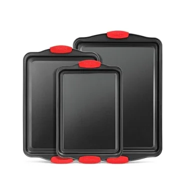 BAKKEN 3-Piece Nonstick Cookie Sheet Set - Stackable Carbon Steel Baking Pans with Silicone Handles