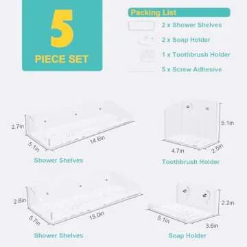 Show more Transform your bathing experience with the ultimate solution for organizing your shower essentials! This premium 5 Hanging Shower Organizer Set effortlessly combines functionality and style, featuring 2 acrylic shower caddies, 2 soap holders, 1 toothbrush holder, and 5 high-strength adhesives. Designed to enhance any bathroom, kitchen, dorm, toilet, or tool room, this set optimizes storage space while keeping your essentials within easy reach.