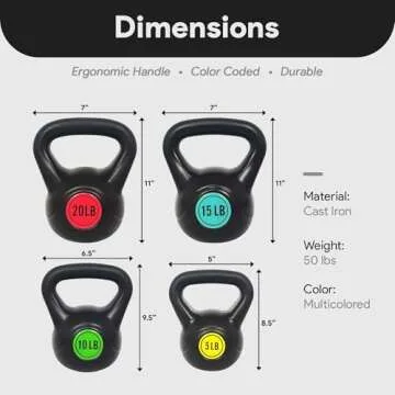 Show moreTransform your fitness routine with the BalanceFrom Wide Grip Kettlebell Exercise Fitness Weight Set. This incredible set includes four kettlebells, each varying in weight from 5 to 20 pounds, designed for anyone looking to enhance strength training, build endurance, and improve overall health. The kettlebells are made from durable vinyl materials, ensuring they are rust-preventive and long-lasting. The vibrant multicolor design not only adds a touch of fun to your workouts but also helps you easily identify your desired weight. Whether you are a beginner or a seasoned athlete, this kettlebell set offers a versatile workout option suitable for various exercises and skill levels.