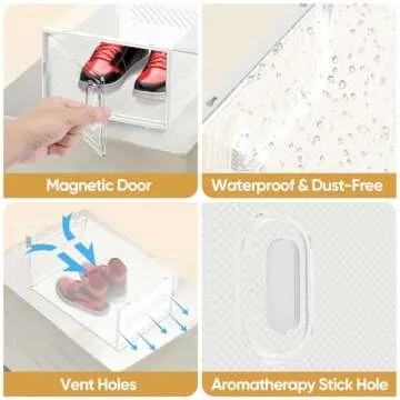 Show moreIntroducing the BALEINE 12 Pack Stackable Shoe Storage Boxes, the ultimate solution for your footwear organization needs! Designed with both functionality and style in mind, these clear and sturdy bins not only keep your shoes protected but also showcase your collection beautifully. Crafted from thickened BPA-free ABS and PP material, they ensure durability and longevity, perfect for daily use. With a spacious design, the large size fits up to Men's 9/Women's 10 (US), while the X-Large accommodates sizes up to Men's 11/Women's 12 (US). The innovative magnetic door closure secures your items while allowing for easy access, complemented by ventilation holes that promote air circulation and prevent odors. No more clutter – it's time to transform your closet!