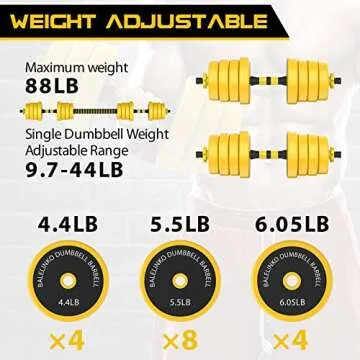 Show more Elevate your workout routine with our versatile 2-in-1 Adjustable Weight Training Equipment Set. This innovative set includes a variety of 16 weight plates: 4 x 4.4 lb, 8 x 5.5 lb, and 4 x 6.05 lb, allowing you to customize your weights to suit your training needs.