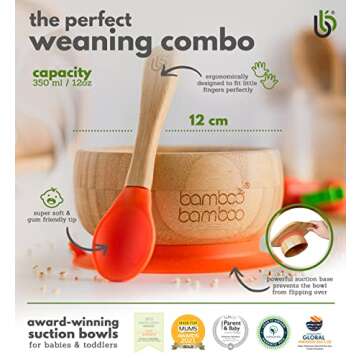 Show moreThe **Bamboo Baby Bowl and Plate with Suction** is a revolutionary mealtime companion designed specifically for your little ones. Crafted from sustainably sourced, non-toxic bamboo, this kids and toddler suction cup plate offers a unique blend of safety, functionality, and fun. Available in a vibrant orange bundle, this plate features three separate compartments that not only keep food visually appealing but also encourage a balanced diet as your child explores new flavors. Unlike traditional plastic plates, the bamboo material stays cool to the touch, ensuring safe handling during mealtime, making it perfect for baby-led weaning.
