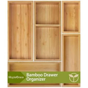 Show more Transform your cluttered spaces into organized havens with our exquisite Bamboo Drawer Organizer Set. This thoughtfully curated set features five exceptional storage boxes crafted from natural bamboo, elegantly merging functionality with aesthetics. It’s not just about practicality; it brings a touch of nature into your home, providing a smooth surface that is durable and visually pleasing. Say goodbye to chaos in your drawers, whether it’s for cosmetics, jewelry, kitchen utensils, or office supplies—this versatile set is designed to breathe order into your everyday spaces.