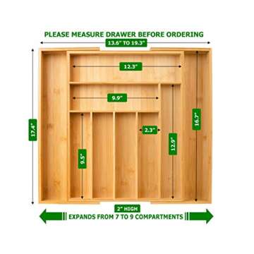 Show more Transform your kitchen storage with the exquisite Bamboo Kitchen Drawer Organizer. This large and expandable utensil holder is crafted from premium 100% Moso bamboo, known for its durability and eco-friendliness. With a sleek design that suits any decor style, this organizer helps you keep your silverware, kitchen gadgets, and other accessories neatly sorted and easily accessible. Enjoy the beauty of natural bamboo and the functionality of a well-organized kitchen.