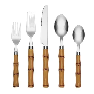 With each place setting designed for four, this 20-piece set includes everything you need: dinner forks, salad forks, dinner knives, dinner spoons, and teaspoons. The sturdy weight of the silverware delivers a sense of quality that adds to your dining pleasure. The bamboo motif on the handles complements various table settings, ensuring that your meals are not only functional but also a feast for the eyes.