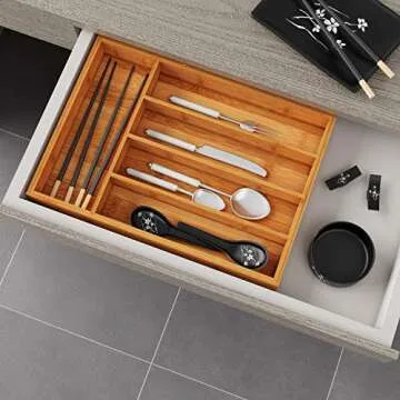 BAMEOS Drawer Organizer Bamboo Silverware Holder, Cutlery Tray 9.76 inches Flatware and Utensil Organizer for Knife Spoon Tool Kitchen Garage