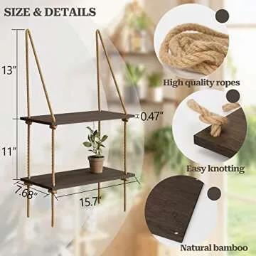 BAMFOX Hanging Wall Shelves,Swing Rope Floating Shelf,2 Tier Bamboo Hanging Storage Shelves for Living Room/Bedroom/Bathroom and Kitchen