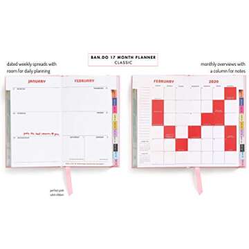 Show moreThe ban.do Classic Planner is your ultimate companion for organization and creativity, designed to keep you on track and inspired throughout your academic or professional journey! Spanning an impressive 17 months from August 2019 to December 2020, this planner combines functionality with beautiful artistry, making planning a joyful experience. With its matte laminated hardcover, this planner is not only durable but also visually stunning, showcasing vibrant colors and captivating artwork. The easy-to-use color-coded monthly tabs offer quick access, while each month features motivational quotes that uplift your spirit.