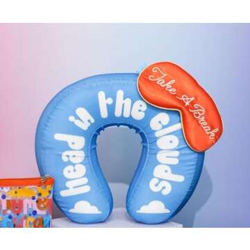 ban.do Getaway Travel Pillow with Washable Cover, Blue Neck Pillow for Sleeping in Airplanes or Cars, Head in The Clouds
