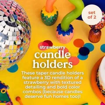 Show more Introducing the delightful Strawberry Candle Holders, an enchanting addition to any home décor. Crafted with precision, these ceramic candle holders feature a stunning 3D rendition of strawberries, complete with textured detailing that adds depth and interest. With their vibrant colors, they are sure to be a standout piece wherever they are placed. These charming holders each come with a small, round top opening that securely holds a single tapered candle, allowing you to infuse warmth and light into your space. Each holder measures 3 inches wide and 3 inches tall, making them the perfect size for any flowering table centerpiece or whimsical mantle decoration.
