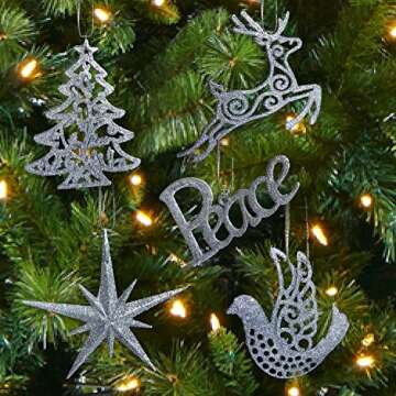 Show more Elevate your holiday decor with the stunning BANBERRY DESIGNS Silver Christmas Ornaments. This exquisite pack of 25 shatterproof decorations features a beautifully curated selection that includes symbols of peace, doves, reindeer, Christmas trees, and Moravian stars. Each ornament is adorned with a sparkly glitter finish, adding a touch of elegance and sparkle to your Christmas tree. Designed for durability and ease of use, these lightweight ornaments are perfect for families with children and pets, allowing everyone to enjoy the festive spirit without the worry of fragile pieces. Not only do they bring joy to your home, but they also create lasting memories as you hang them year after year.