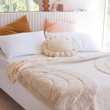 Show more Transform your living space with the enchanting Banilla Bohemian Natural White Throw Blanket. This stunning handwoven piece is more than just a blanket; it's a statement of style that embodies the true essence of bohemian decor. Measuring a substantial 50 x 60 inches, this lightweight throw is perfect for draping over your favorite chair, couch, or at the foot of your bed. The beautiful rainbow design, featuring shaggy tufting and playful tassels, adds a touch of whimsy and cozy charm to any room.