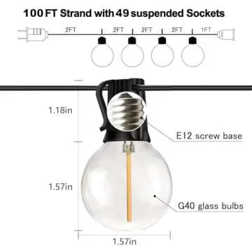 Show more Transform your outdoor space with the enchanting glow of the Banord String Lights. This meticulously designed lighting solution includes a generous 100ft long durable strand with 49 sockets and 50 stylish plastic bulbs, ensuring you have the perfect setup for any outdoor gathering. Whether you're dressing up your deck, porch, or backyard, these lights create a romantic ambiance that will charm your family and friends. With its warm, cozy 2700K light, it’s perfect for creating the ideal setting for every occasion.