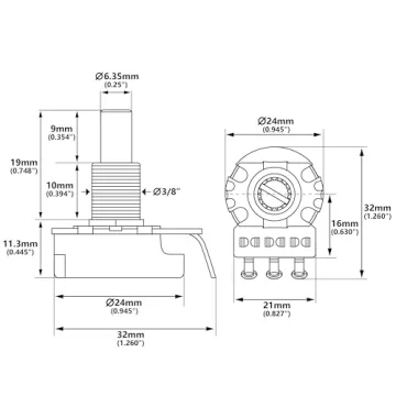 Engineered with a **6.35mm (1/4 inch)** imperial solid shaft, it integrates seamlessly with standard US guitar knobs, eliminating compatibility issues. The precise specifications, including a shaft length of 19mm and a threaded portion height of 10mm, provide the perfect fit for your instrument. Designed for ease of installation, each package includes everything you need for a hassle-free upgrade, including a nut, flat washer, and internal tooth lock washer, ensuring your potentiometer remains securely in place.
