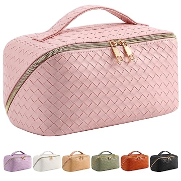 Baonmy Large Capacity Travel Bag - Makeup Bag,Portable PU Leather Waterproof Cosmetic Bag for Women,Travel Makeup Organizer with Handle and Divider Flat Lay Makeup Organizer Bag (Pink)