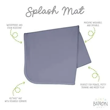 Show moreIntroducing the BapronBaby Minimalist Slate Splash Mat—your ultimate companion for keeping messy moments manageable! Crafted from a unique blend of durable polyester fused with a buttery soft waterproof layer, this splash mat measures 45" x 45"—perfectly sized to catch all those unexpected messes. Its innovative design ensures that it won't peel or tear over time, assuring you of longevity and reliability. Whether at home, in the yard, or on family outings, this mat offers peace of mind with its proven ability to protect floors, tables, and carpets from splats and spills. Plus, its lightweight design (weighing in at less than 8 oz.) makes it ideal for transport and easy storage, ready to tackle any mess life throws your way.