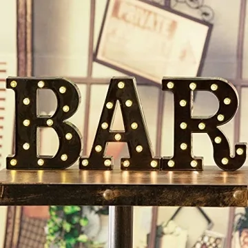 Show more Illuminate your space with charm and personality using our delightful Plastic Marquee LED illuminated letter set that spells out BAR. This enchanting decor piece measures 23.02 inches long and 1.77 inches wide, standing at an impressive height of 8.86 inches. Perfect for both home and commercial settings, it features a total of 38 warm LED lights that bring a vibrant glow to your bar area, creating an inviting atmosphere for any occasion. The visual dynamics of each individual letter make it even more appealing: the letter B measures 7.28 inches wide, A is 7.67 inches wide, and R stands at 8.07 inches wide, proportionally designed to enhance your decor.