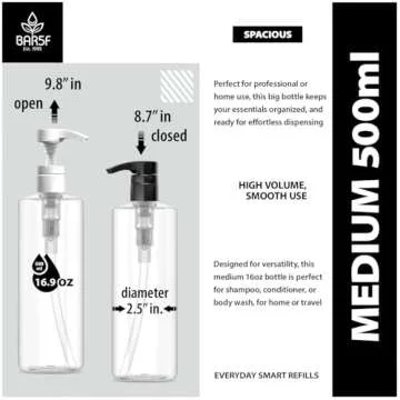 Show moreIntroducing the Bar5F Plastic Lotion Bottles, your ideal solution for an organized and stylish bathroom experience. These 16 oz bottles come with both black and white pumps, allowing you to customize your look while seamlessly integrating into your bathroom décor. With an impressive height of 10 inches (open) and 8.5 inches (closed), paired with a compact 2.5-inch diameter, these bottles are as functional as they are aesthetically pleasing. Crafted from durable, BPA-FREE, Food Grade PETE1 Plastic, they ensure that your most cherished liquids—be it shampoo, conditioner, or moisturizer—remain pure and free from contamination.