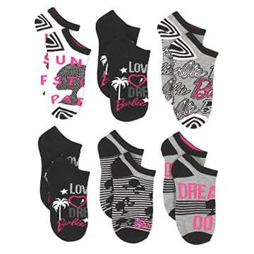 Show moreStep into a world of vibrant joy with the Barbie Doll Girls Womens 6 Pack Socks! Perfectly designed to delight fans of all ages, these socks embody the playful spirit of Barbie while offering unparalleled comfort. Available in a convenient shoe size range of 4-10 (sock size: 9-11), these socks boast a chic color palette that combines classic Black, fresh White, and playful Pink hues. Crafted with high-quality materials, each pair ensures breathability and durability, making them perfect for everyday adventures, school, or special occasions.