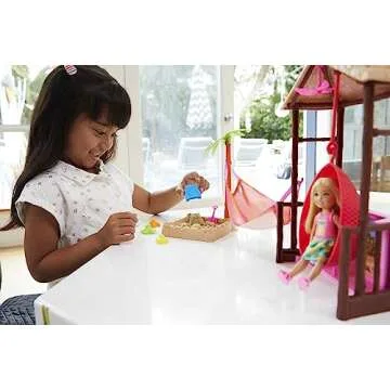 Show more The Chelsea doll and Tiki Hut playset is a delightful escape into a vacation oasis designed to inspire creativity and adventure in young imaginations. This wonderful playset includes moldable sand that can be sculpted into various shapes, providing endless fun on the sandy shores. Children can build stunning sand sculptures using the included shovel and four different molds – a sand castle, a starfish, a turtle, and a shell. The moldable sand allows for quick reshaping, giving little ones the freedom to start over and create again without waiting for tides to roll in.