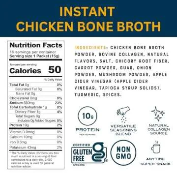 Show moreIntroducing the Bare Bones Bone Broth Instant Powdered Beverage Mix - your go-to solution for a deliciously nutritious boost on the go! Each convenient pack contains 16 sticks, delivering a hearty 15g serving packed with 10g of protein. Perfect for those following keto and paleo diets, this premium broth mix is designed to complement your busy lifestyle while satiating your culinary cravings. With four delightful flavors, including traditional chicken, invigorating lemon ginger, exciting Thai coconut, and rich ramen, there's a palate-pleaser for every taste.
