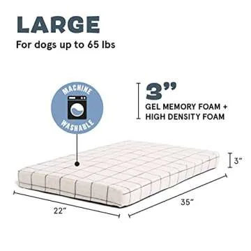 Show more The BarkBox Orthopedic Dog Bed is the ultimate comfort haven for your furry friend! Designed specifically for medium to large breeds, its dimensions—35” x 22” x 3” —make it an ideal fit for beloved breeds like Corgis, Australian Shepherds, Bulldogs, and similar-sized dogs weighing up to 65 lbs. What sets this bed apart is its therapeutic cooling gel memory foam, a perfect solution for dogs suffering from body aches, joint pain, hip dysplasia, and arthritis. Treat your dog to restorative sleep and eventual rejuvenation with this thoughtfully designed bed.