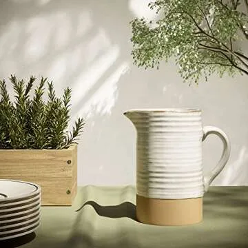 Show more Introducing the stunning Ceramic Milk Pitcher - a beautifully crafted piece designed to elevate your home décor while serving practical purposes. This multifaceted ceramic pitcher features a delightful combination of a fresh and earthy palette, making it an ideal addition to any farmhouse-themed space. Its vintage charm is accentuated by the rustic feel it brings to your kitchen or dining area. Measuring at a compact 7” x 5” x 7.25”, this pitcher has a generous volume of 1.5 quarts or 50 oz, perfect for serving refreshing beverages or displaying your favorite flowers.