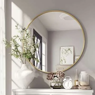 Show moreIntroducing the stunning Barnyard Designs Round Metal Mirror—a perfect blend of elegance and functionality that effortlessly enhances your home decor. This versatile, decorative round mirror transforms any space, whether it’s your bathroom, bedroom, or living room, providing a chic accent that complements a variety of styles. The sleek gold frame adds a touch of sophistication, while the meticulous craftsmanship ensures durability and quality. Measuring 24" in diameter, it’s large enough to make a statement without overwhelming your space, making it an essential addition to your home.