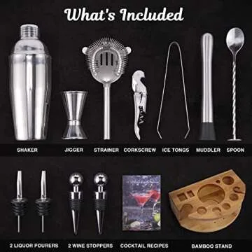 The kit includes a 25oz cocktail shaker, muddler, jigger, strainer, ice tongs, corkscrew, liquor pourers, and a bamboo stand.