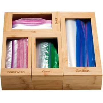 Bartnelli Bag Organizer for Kitchen Storage Organization, 4 PC Premium Bamboo Drawer Organizer, Bag Holder Dispenser
