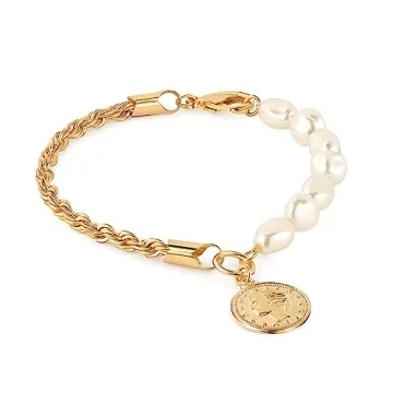 Barzel 18K Gold Plated Rope & Pearl Bracelet with Coin Charm, 7.5 Inches - Made in Brazil
