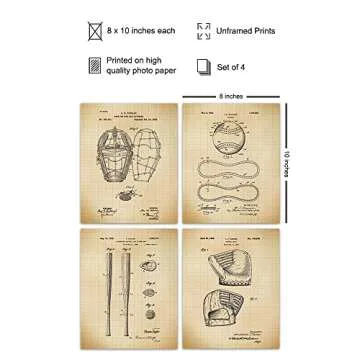 Show moreTransform your space with the Baseball Patent Art Prints, a stunning collection of four vintage-inspired wall art pieces that capture the essence of baseball's rich history. Each 8x10 print features unique patent designs that bring a chic contemporary flair to any room. Whether you're a dedicated fan, a parent wanting to enrich your child's room, or simply someone who appreciates unique decor, these prints will undoubtedly add a touch of nostalgia and sophistication to your home. Ideal for boys', teens', and even office spaces, they perfectly blend modern and retro styles, making them a fantastic addition to any interior design theme. Hang them in a living room, den, or even a man cave for that extra pop of style. Plus, the unframed prints leave you the flexibility to choose a frame that complements your personal aesthetic.