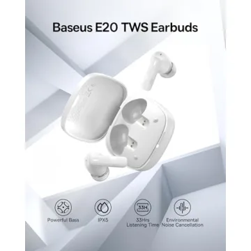 Show more Experience unparalleled audio with the Baseus E20 True Wireless Earbuds. Designed for music lovers on the go, these earbuds feature oversized 12mm drivers that deliver a strong bass performance while ensuring clarity across all frequencies. Perfect for commuting, workouts, or simply enjoying your favorite playlists at home, these earbuds have quickly become essential to daily routines. With up to 33 hours of playtime thanks to its charging case, long listening sessions without interruption are guaranteed, making them a must-have for anyone seeking quality sound without the hassle of frequent recharging.