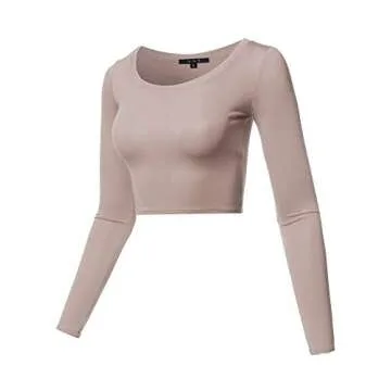 Basic Solid Stretchable Scoop Neck Long Sleeve Crop Top Mocha S