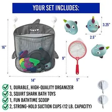Bath Toy Organizer and Shark Bath Toy Set | Bath Toys for Toddlers | Bath Toy Holder | Tub Toy Storage with Strong Suction Cups | Mesh Bath Toy Organizer | For Baby, Kids, and Toddlers