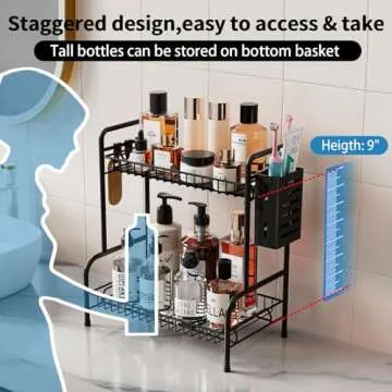Versatility is another hallmark of this product. Whether you’re storing bathroom essentials like lotions and shampoos, or organizing kitchen items like condiments and grains, the Metal Bathroom Organizer is your go-to solution. The two-tier design along with additional hooks allows for multifunctional use, making it perfect for toiletries, makeup brushes, or kitchen accessories.