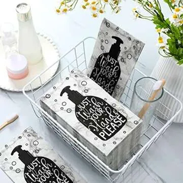 Show more Introducing the delightful bathroom disposable napkins—a charming addition to any washroom environment! These unique napkins are adorned with whimsical designs featuring hand sanitizer bottles and the friendly reminder: 'Just Wash Your Hands Please.' They are not just eye-catching; their design is meant to engage and encourage good hygiene habits among guests. The inclusion of stars, foam elements, and playful graphics make these napkins visually appealing, instantly drawing attention and prompting action.