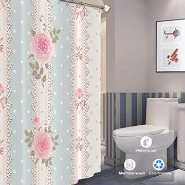 Show moreTransform your bathroom into a stunning retreat with the Batmerry Shabby Chic Roses Decor Shower Curtain. Measuring a generous 60 inches in width and 72 inches in length, this beautifully designed shower curtain is perfect for adding a touch of vintage elegance to your space. Featuring a delightful combination of floral stripes and polka dot lace patterns, this curtain successfully merges style with functionality. Crafted from durable polyester fabric, it boasts waterproof and quick-drying properties, ensuring that your bathroom remains fresh and inviting.