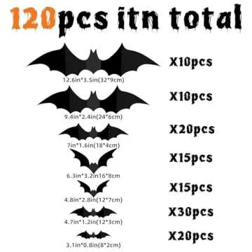 Show moreElevate your Halloween spirit with the **Bats Wall Decor 120PCS** - the ultimate decoration for your Halloween gatherings! These **realistic PVC 3D black scary bat stickers** will transform any space into a spine-tingling bat cave, captivating your guests and trick-or-treaters alike. Designed with versatility and horror in mind, you can easily create scenes both indoors and outdoors with these bats that flutter and flow with the flicker of lights. Perfect for October parties or haunting events, this decor set is everything you need to unleash your creativity and add a chilling ambiance to any environment.