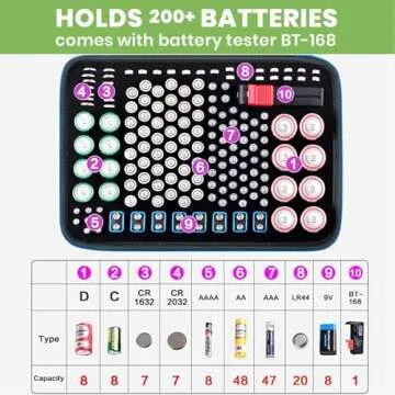 Show more Discover a new level of organization with the Household Battery Organizer, a must-have for every home. This all-inclusive storage solution is designed to hold over 200 batteries efficiently while keeping them accessible and safe. The kit includes the BT168 battery tester, ensuring you never have to worry about finding a dead battery again. Measuring at 12.5(L)*9.84(W)*3.14(H), it’s perfectly sized to fit in any drawer or garage shelf without consuming too much space.
