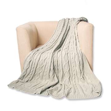Battilo Luxury Cable Knit Throw Blanket, 50" W x 60" L, natural/light gray