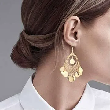 Show more Elevate your footwear with the artistic elegance of the BaubleStar Gold Disc Earrings. These chandelier drop earrings are a magnificent fusion of vintage bohemian appeal and modern sophistication. Crafted from premium zinc casting and beautifully finished with shiny gold plating, these earrings epitomize timeless beauty and fine craftsmanship. With a generous length of 2.75 inches and a width of 1.57 inches, they present a striking silhouette that adds a touch of drama while remaining incredibly wearable.