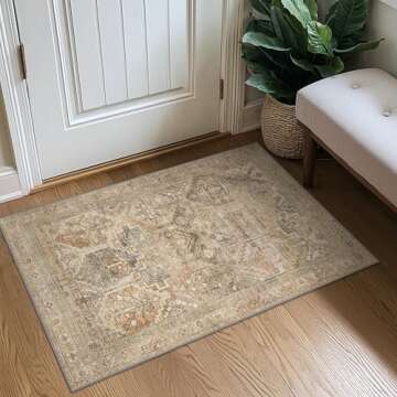 Show moreIntroducing the Bavni Area Rug, a beautifully crafted 2x3 machine washable rug that seamlessly blends style and functionality. This ultra-thin chenille rug features a stunning vintage distressed print in a chic clay color, making it the perfect addition to any space, from a cozy bedroom to a bustling kitchen. Measuring just 5mm, it won’t pose a tripping hazard, ensuring safety for children, pets, and seniors. The hypoallergenic polyester material is not only lightweight but also has a sturdy rubber backing, providing excellent grip and ensuring the rug stays securely in place. Whether you're looking to enhance your entryway or create a warm atmosphere in your living room, this versatile rug caters to all your decorative needs while also promising durability and ease of maintenance.
