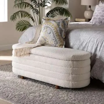 Japandi storage bench; Rounded legs; Assembly Required Yes; Warranty 30 Days Limited; Finish Walnut Brown; Color Cream/walnut Brown; Material Plywood/MDF/Boucle Fabric "95% Polyester, 5% Acrylic "/Foam/Rubber Wood; Product Weight (Lb) 37.5; Product Dimensions(L x D x H) 48.8" x 17.5" x 17.7"